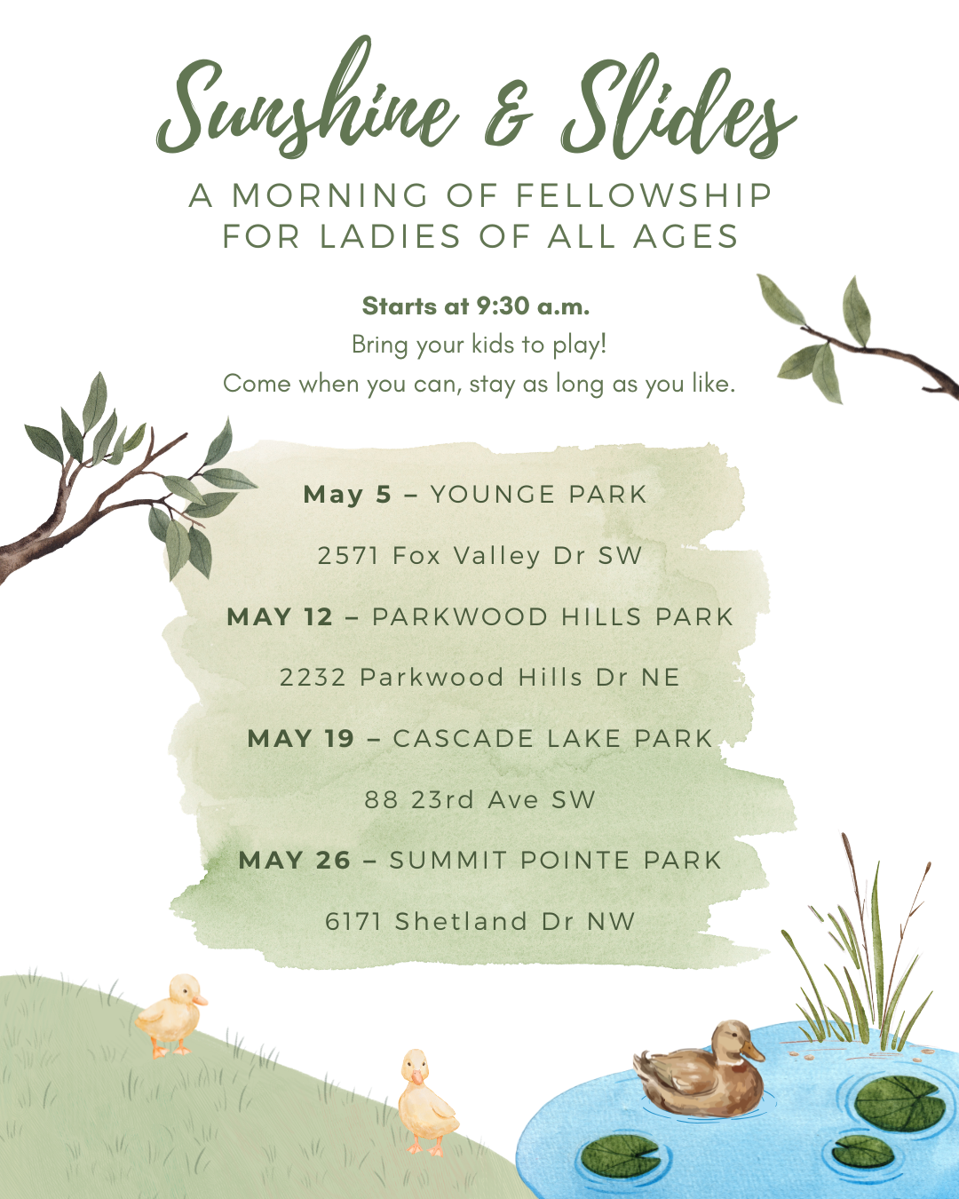 Sunshine and Slides is a great opportunity to get outside and enjoy our beautiful parks together and connect with other NCC women. We meet at a different playground around Rochester once a week throughout the spring and summer. Ladies of all ages and stages of life are welcome. If you are older, single, younger without kids, please come... all are encouraged to join in on the fellowship.